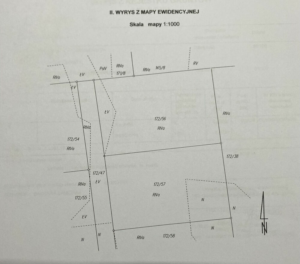 Numer działki 172/57 Gady. Klasa gruntu RIV, wymiary 44x70 m;
